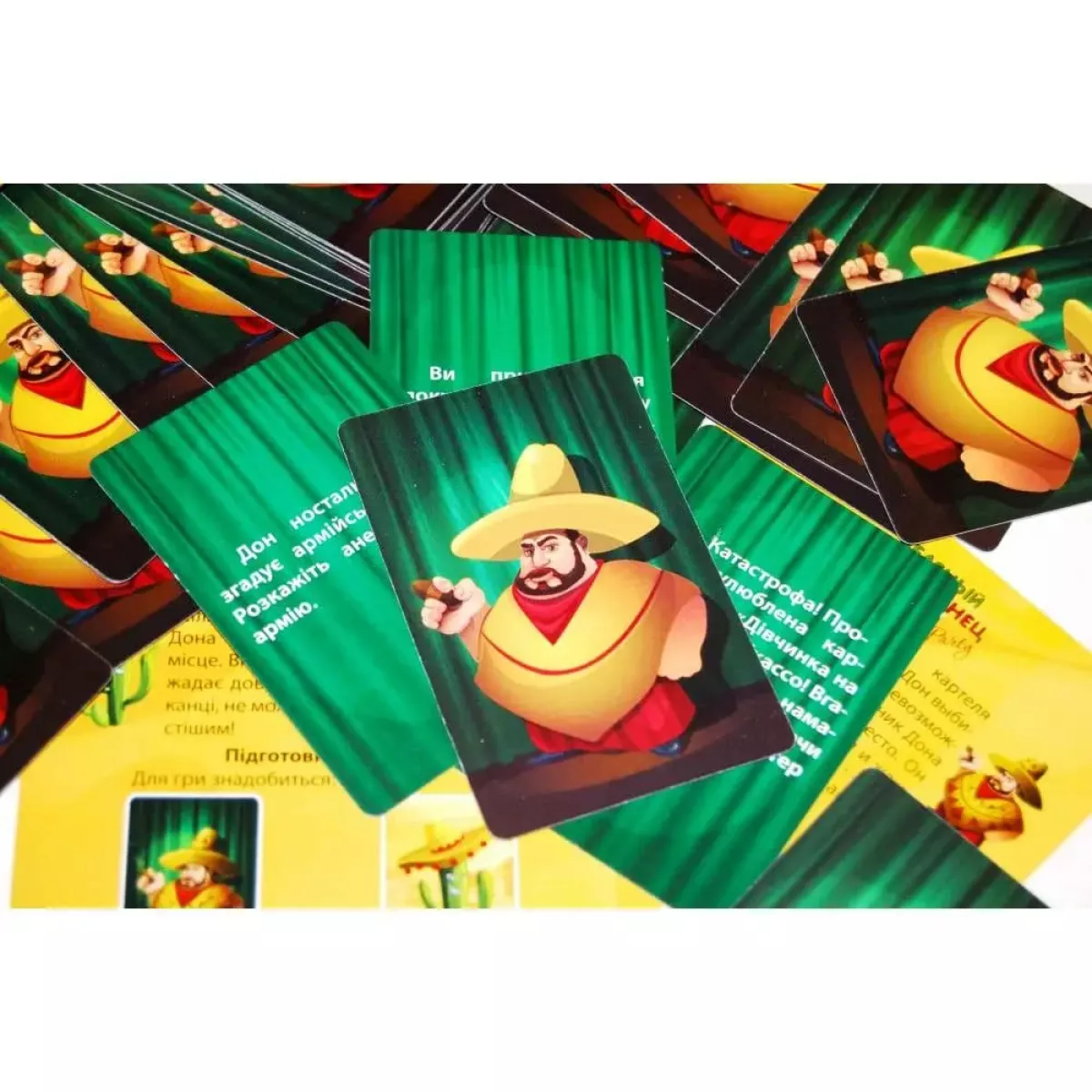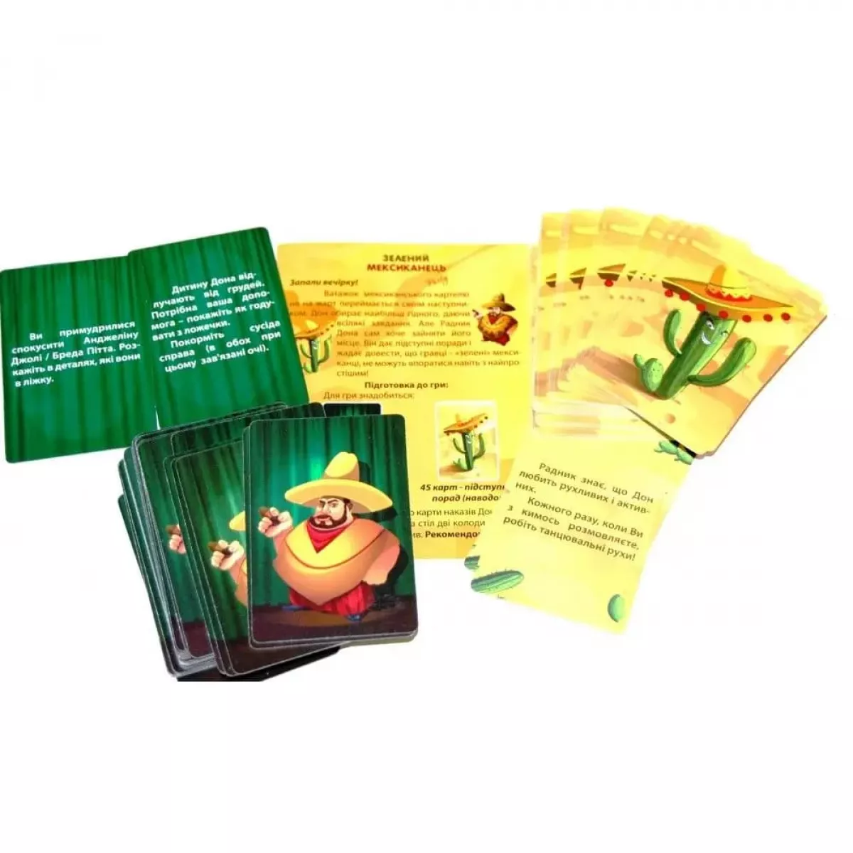 Хочете зробити свою вечірку незабутньою? Для веселої компанії найкраще підійде запальна настільна гра! "Зелений Мексиканець" — саме така. Вона універсальна для будь-якої вечірки і розрахована на компанію, де люблять цікаво провести час: - легкі та короткі правила, час освоєння - до 5 хв; - гра прикрасить будь-яку вечірку, навіть ту, де всі "за кермом"; - можна грати як втрьох, так і великою компанією; - метою є не стільки сама перемога, скільки цікавий і веселий процес гри. Дон (голова мексиканської мафії) обирає собі наступника серед гравців. Але його радник, який сам мріє очолити картель, постійно влаштовує претендентам всілякі каверзи, намагаючись показати, що всі вони — лише "зелені" мексиканці, і не гідні зайняти місце Дона. У комплект входять картки двох видів — 45 наказів Дона (виконує гравець), 45 підступних порад Радника (гравець передає їх виконання будь-якому іншому гравцю) і правила гри.                                  А якщо неможливо виконати дві (три) картки-поради Радника одночасно? Отже, вам не пощастило і шанси стати "зеленим мексиканцем" значно збільшилися :) Наприклад, якщо в одній карті написано, що ліву руку потрібно тримати на потилиці, а в іншій, що ліва рука повинна прикривати коліна, то доведеться порушити принаймні одну з них. А якщо гравець не може виконати описаний в картці наказ Дона? Що означає не може?! Він же не хоче розчарувати Дона? :) Потрібно пробувати, поки не вийде.  Пауза можлива? Які паузи?! Боротьба за імперію картелю в самому розпалі! Замовляючи алкоголь, жуючи ароматний шашлик або відповідаючи на телефонний дзвінок, гравець зобов'язаний виконувати всі призначені йому накази Дона або карти з порадами. Переможе найпідприємливіший і уважний, але задоволення і позитивні емоції отримають усі!