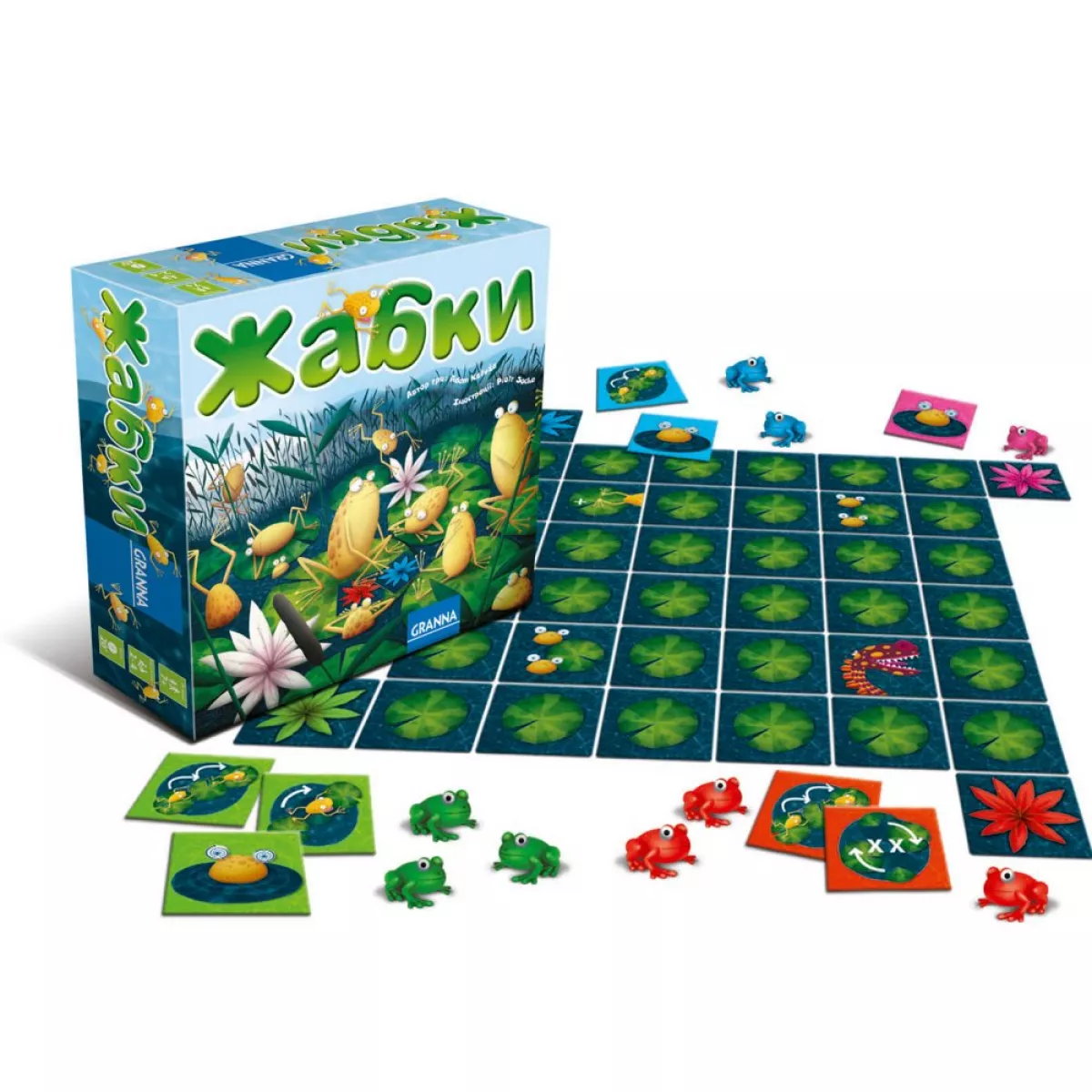 Добре знана та улюблена гра Ква-а-а! отримала нове життя. Правила оновлено – поринай у нові пригоди! Жабки – це тактика, можливість вибору, планування, і, врешті-решт, це – весело! В глибокому ставку, порослому листям латаття, живе зграйка барвистих жабок. Час від часу жабенята влаштовують змагання на прудкість. Але дорогою їх підстерігають різні сюрпризи та навіть небезпека. Іноді з глибини виринає зубчаста паща підводного монстра… Як грати? Виберіть одну з трьох своїх жабок та стрибніть нею на сусідню плитку. Листок, з якого стрибнула жабка, занурюється під воду. Ви можете: відновлювати листки, вибирати ефект однієї з 8 дій, щоб швидше просунутися до мети, заважати суперникам здійснити задумане. Виграє той, хто першим переправить всіх своїх жабок у безпечне місце.