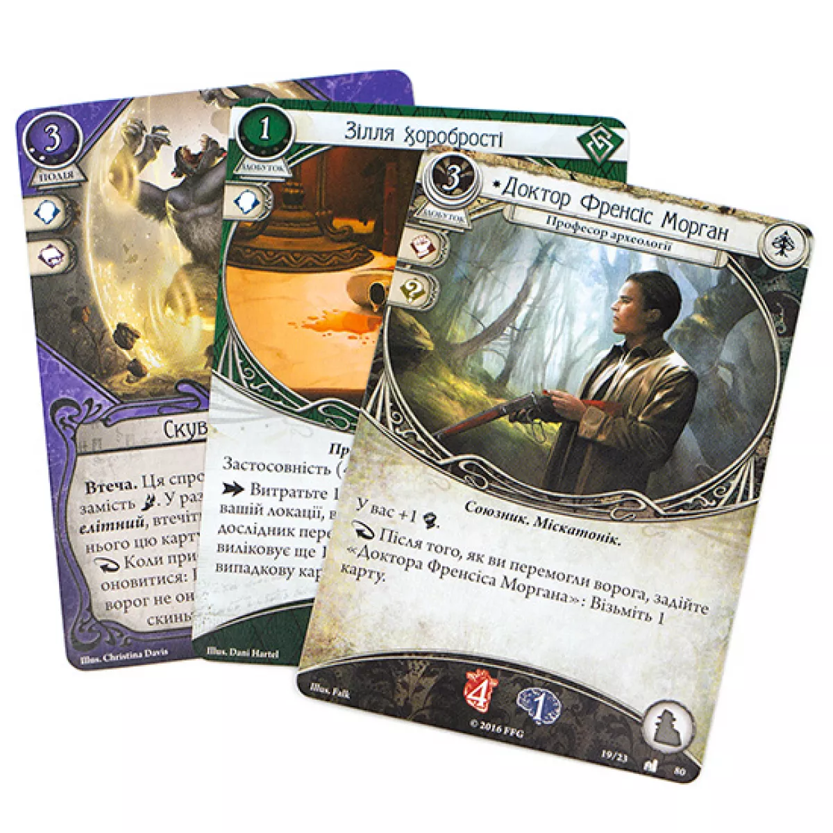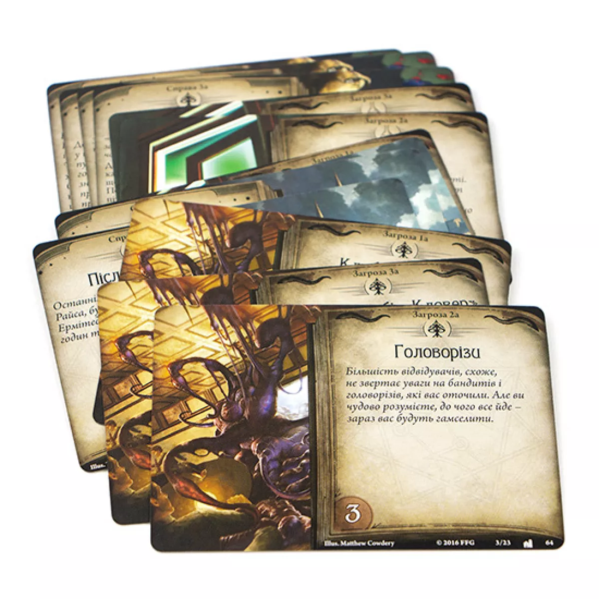 Увага! Це доповнення. Для гри вам знадобиться базова версія Жах Аркгема. Карткова гра. Ви давно вже в хороших стосунках із головним бібліотекарем Міскатонікського університету доктором Генрі Армітеджем. Тож коли він попросив про термінову допомогу, ви ні хвилини не думали, щоби вирушити у Данвіч. Тільки зайшовши в його будинок, ви одразу зрозуміли, що щось не так. Сам доктор дуже стурбований, а на його столі лежить величезний завал із книжок і паперів. На нього це несхоже, адже він дуже любить порядок… Генрі Армітедж одразу ж розповів нам у чому справа: його давній колега Уоррен Райс не прийшов на зустріч. Доктор має відчуття, що тут щось нечисто… Більше того, інший колега, Френсіс Морган, який міг би знати про місцезнаходження Уоррена, теж не виходить на зв'язок. Якось усе занадто підозріло… Потрібно спробувати з цим розібратися у доповненні Жах Аркхему: Карткова гра ‒ Спадщина Данвіча. Як могли одночасно пропасти двоє вчених? Перед нами перше велике доповнення до настілки Жах Аркгема. Карткова гра, яка вводить нас в велику сюжетну кампанію, що складається з восьми сценаріїв. У цьому наборі присутні перші дві ввідні історії, які можна пройти в будь-якому порядку. Але кожна з них може серйозно вплинути на сюжет наступної. У комплекті цього доповнення ви знайдете чимало компонентів для ваших нових пригод: 92 карти сценаріїв, 59 карт гравців і що не менш важливо ‒ 5 нових детективів. Вони суттєво не змінюють ігровий процес, але мають особливі умови створення своєї колоди. Вам варто ознайомитися з нею на зворотній стороні листа персонажа. Сюжети в доповненні Жах Аркхему: Карткова гра ‒ Спадщина Данвіча на вас чекають досить розгалужені. Від ваших дій залежить те, куди вас заведе чергова історія. Усіляких варіантів більше, ніж достатньо, тож пройти ці сценарії можна неодноразово навіть не в рамках кампанії. Сценаристи змогли розтягнути всю свою розповідь на цілих 7 доповнень, тож їм було де розгулятися. Важливим нововведенням у цьому доповненні є поняття «Вигнання», яке змушуватиме вас позбуватися карт назовсім до кінця сценарію. Між місіями ви зможете заново купувати їх за очки досвіду, якщо забажаєте. Без монстрів тут навряд обійшлось Доповнення Жах Аркхему: Карткова гра ‒ Спадщина Данвіча дозволяє учасникам пройти захопливу історію, яка вас заведе невідомо куди… Із кожною новою частиною кампанії пригоди ставатимуть усе епічніші, а ваші минулі вибори матимуть вплив на подальші дії. Локальні проблеми відступають вбік, коли на кону доля всього людства. У настільній грі Прадавній жах доведеться подорожувати по всьому світу, щоби закривати ворота в потойбіччя, боротися з монстрами та розгадувати загадку Древнього. Нізащо не можна дати йому проникнути в наш світ…