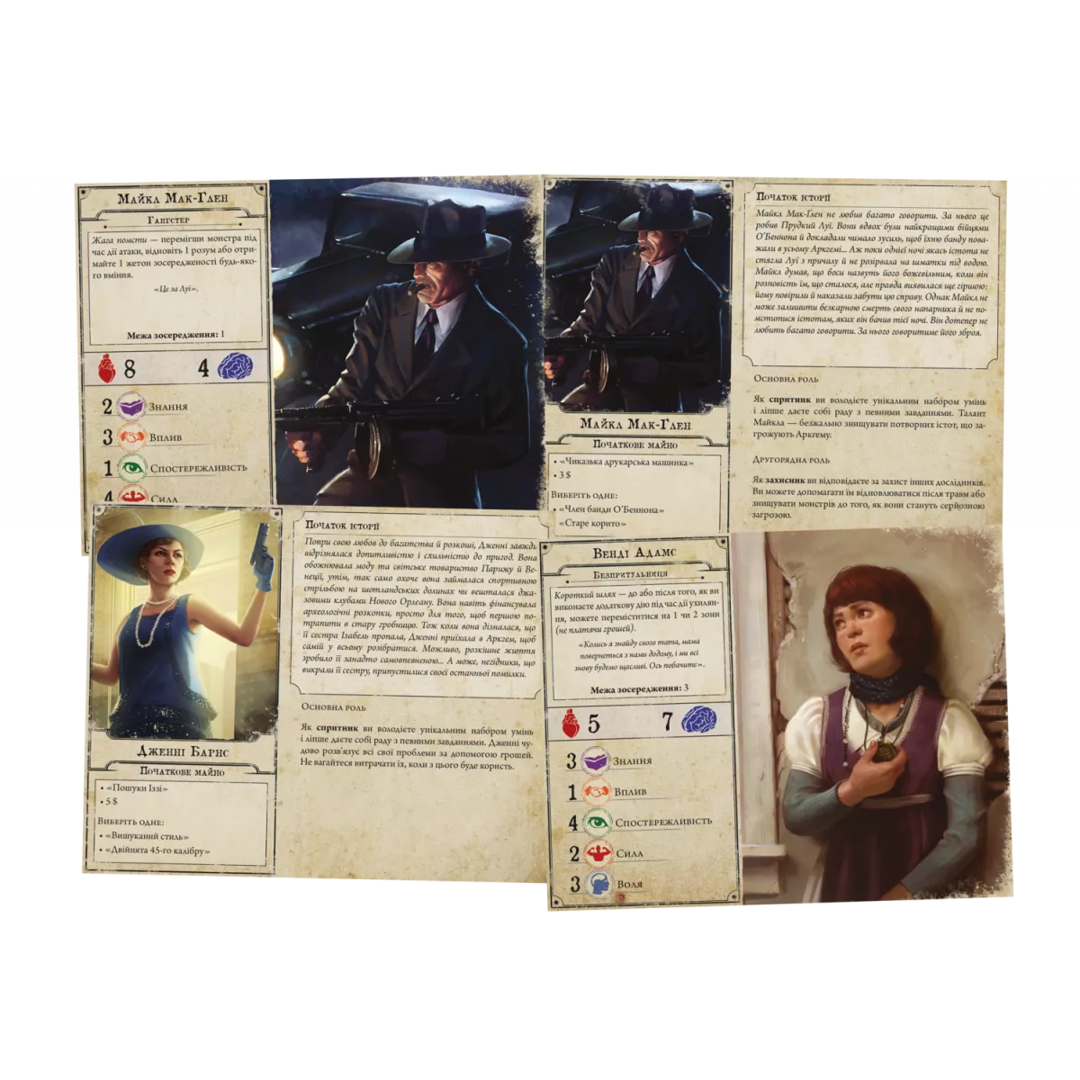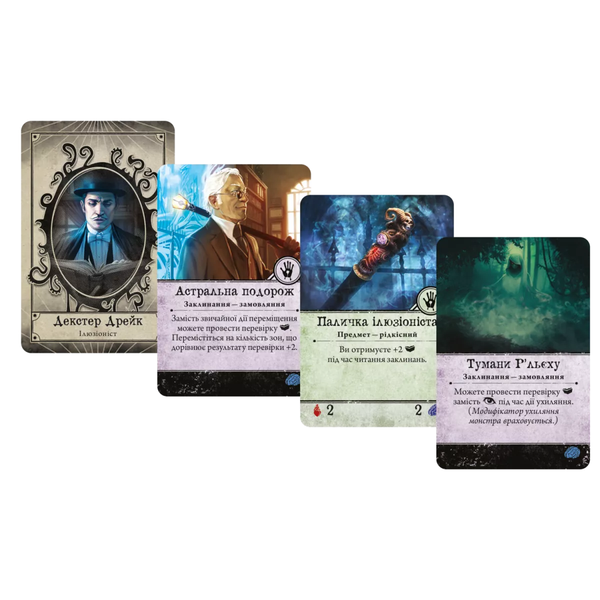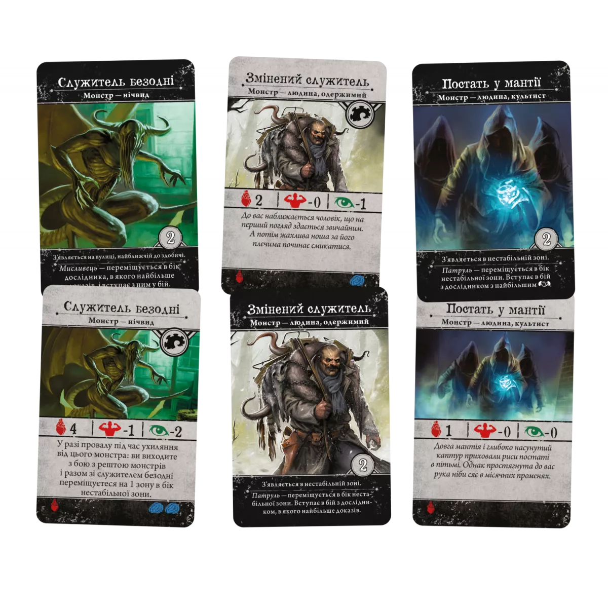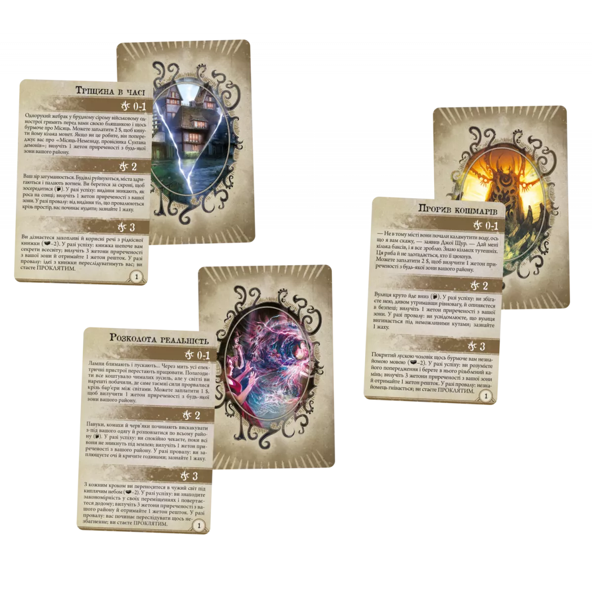 У коробці Правила гри, Довідник правил, 12 плиток мапи, 4 листи сценаріїв, 12 листів дослідників 6 карт-пам’яток 32 карти заголовків 40 карт архіву 36 карт аномалій 96 карт подій 72 карти зустрічей 12 карт союзників 28 карт предметів 10 карт заклинань 26 особливих карт 37 початкових карт 12 карт станів 62 карти монстрів, 48 жетонів доказів/приреченості, 42 жетони поранень, 42 жетони жаху, 40 жетонів грошей, 24 жетони решток, 30 жетонів зосередженості, 6 кубиків, 5 жетонів аномалій, 18 жетонів міту 10 маркерів 6 жетонів активації