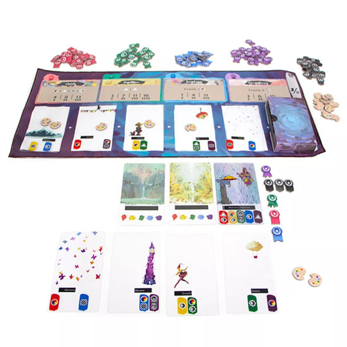 У коробці 60 прозорих карт малюнків;, 1 полотняне ігрове поле;, 100 жетонів стрічок різних кольорів;, 20 жетонів натхнення;, 12 карт умов отримання ПО;, 20 карт з різним фоном;, 32 великі протектори;, 1 коробка для карт;, правила гри.