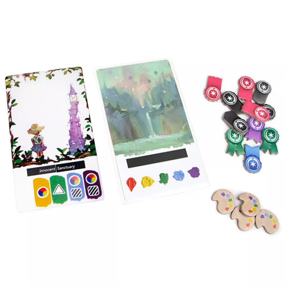 Можливо, ви не знали, але навіть серед живописців проходять змагання. Вам, напевно, цікаво, як їх оцінюють, адже мистецтво – річ доволі суб’єктивна, всі його сприймають по-своєму. На спеціальних арт-фестивалях найкращим художникам пропонують створити декілька картин, які будуть відповідати чітким вимогам. Саме так і визначається переможець у настільній грі Живопис (Canvas). Побачимо, чи вдасться у вас створити декілька ідеальних полотен. Нехай розпочнеться змагання художників Живопис (Canvas) – це надзвичайно гарна швидка стратегічна настільна гра, у якій ви за допомогою різних малюнків, що накладатимуться однин на одного, повинні створити щонайгармонійніші картини. Чим більше вимог у вас вдасться виконати в одному полотні, тим кращий буде ваш результат. Для підготовки до партії необхідно розмістити полотняний планшет творчості (ігрове поле) в центрі столу. У відповідні місця кладуться випадкові або запропоновані авторами карти умов, біля яких також будуть лежати стрічки п’яти кольорів. На тому ж ігровому полі розміщуються 5 карт малюнків. Усі гравці отримують по 3 карти фону, а також 4 токени натхнення, після чого можна розпочинати гру. Учасники ходять за годинниковою стрілкою, виконуючи лише одну дію: взяти малюнок із ігрового поля; створити картину. Перша опція дозволена лише тоді, якщо у вас ще немає 5 карт на руках. Найбільш віддалений від колоди малюнок безкоштовний, а от на кожен пропущений доведеться класти жетон натхнення. Хтось їх отримає разом із цією картою. Коли ви обрали те, що хочете взяти, всі карти підсуваються та відкривається нова з колоди. Друга дія куди цікавіша, адже це саме те, заради чого й відбувається гра. Для цього вам знадобиться рівно 3 карти, які необхідно вкласти у будь-який протектор із фоном у вибраному вами порядку. Від цього залежить те, які об’єкти буде видно на картині, а які ні. Й ось тут починається оцінка вашого вміння малювати. Поступово пройдіться по кожній умові, яким мав би відповідати малюнок. Отримайте медалі, які наприкінці гри принесуть вам переможні очки. Партія завершується, коли кожен із гравців створив по 3 картини. Підраховуються очки за всі медалі, визначається переможець. Ці картини хоч у галереях виставляй Настільна гра Живопис (Canvas) просто чарує своєю красою. Та й хіба могло бути інакше із проєктом, що має таку художню назву? Ігровий процес доволі простий, а різноманітних комбінацій картин можуть бути сотні, а то й тисячі.