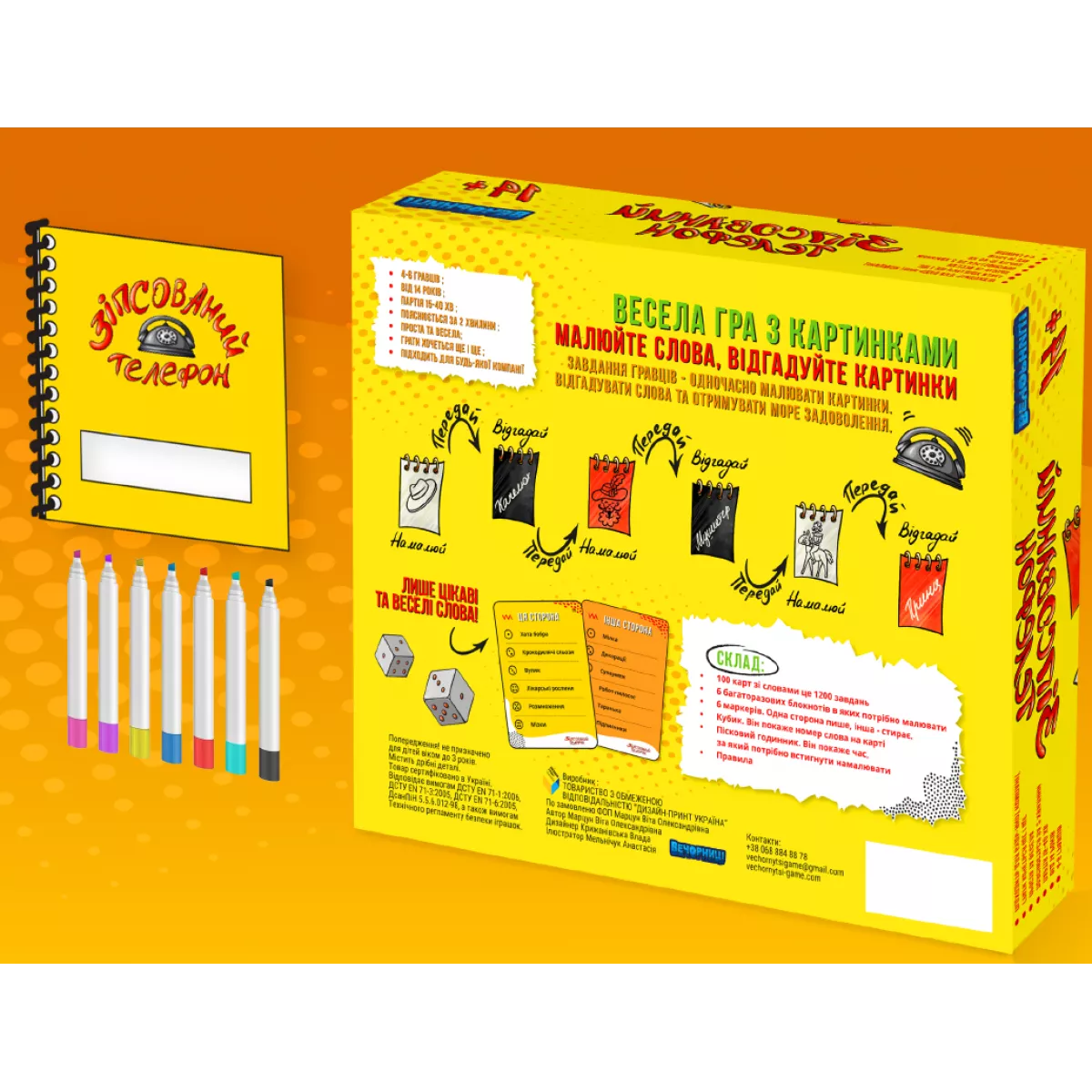 Ми порадились і вирішили, що найбільше це схоже на ведмедя. Все, це наша остаточна відповідь! Як не ведмідь? А хто? Оу, вчителька з англійської… Ну так, схоже, і зачіска, як у неї… Нам треба терміново зіграти реванш, просто цього разу потрібно звертати увагу на дрібнички, поїхали! У вас поганий зв’язок, мабуть перешкоди на лінії Всі ж колись грали у зіпсований телефон, ця гра знайома з дитинства: шепочи слово на вушко і сподівайся, що ніхто в ланцюжку це слово не «спотворюватиме», випадково чи спеціально. Але з приходом все більш сучасних технологій телефон може передавати не тільки слова, а й зображення, тож і новенька гра Зіпсований телефон запропонує вам просунутий та покращений ігровий процес! Перший гравець обирає слово з картки і, замість того, щоб просто тихенько передавати далі, намагається його намалювати. Наступний гравець буде розшифровувати, що ж там таке намальовано, пробувати назвати зображене на цьому витворі мистецтва та передаватиме блокнот наступному гравцю для малювання. Що ж буде в результаті? Сміх, веселощі, розборки, в який момент щось пішло не так, та чому «Їжачок з яблучками» перетворився на «Нафтовидобувну платформу». Чи буде отримана абсолютно правильна відповідь? Чесно кажучи, якщо на вечірці зібралися не екстрасенси, то вірогідність дуже мала. Але це і не головна мета, якщо всі залишилися веселими і задоволеними! А грати буде цікаво всім? Не сумнівайтеся! Адже у цій коробочці передбачені картки як зі звичайними поняттями, так і з дуже простими словами, тож цікаво буде грати навіть малечі, починаючи з 4 рочків! Тож якщо ви хотіли б разом з дітками розвинути їх фантазію, хист до малювання та здібності до вгадування «що ж там таке зображено», не баріться і замовляйте кробочку з грою Зіпсований телефон, або ж зверніть увагу на альтернативну, більш дорослу версію гри Зіпсований телефон.