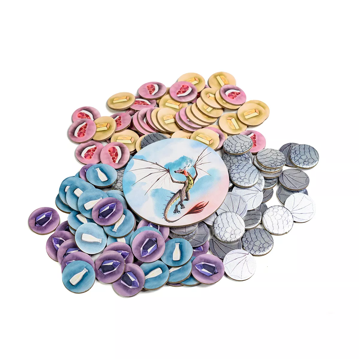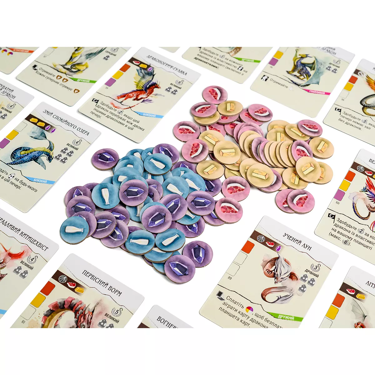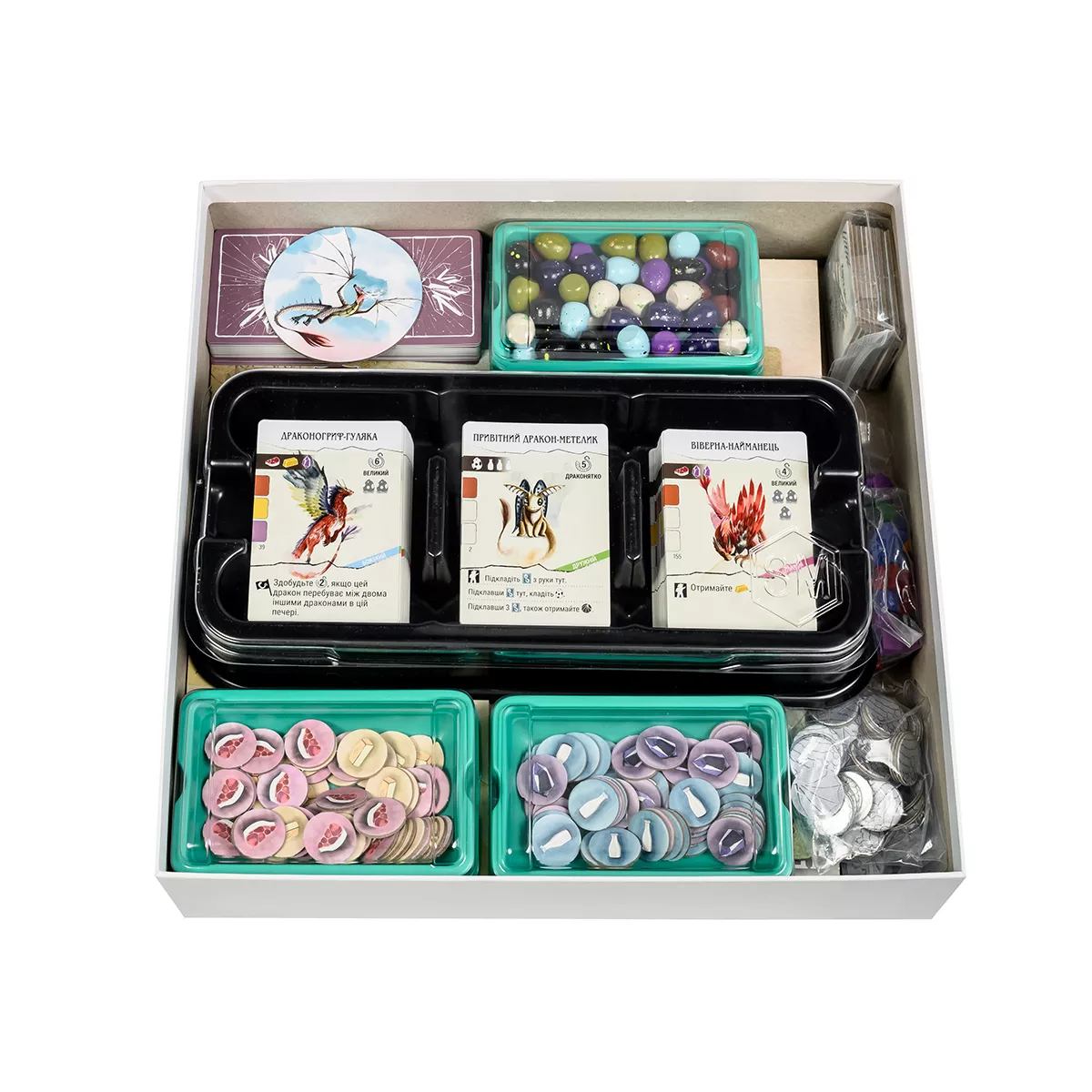 У коробці 2 збірника правил (загальні та для соло-режиму), 1 довідник про драконів (32 сторінки), 5 килимків для гравців, 5 міплів шукачів пригод і 5 жетонів гільдій, 183 карти драконів (148 дорослих драконів і 35 дитинчат), 75 карт печер, 4 гільдії драконів, 55 жетонів яєць у цяточку, 10 двосторонніх тайлів цілей, 45 блискучих картонних монет, 10 карт швидкого старту (по 2 карти на гравця), 17 карток для соло-режиму