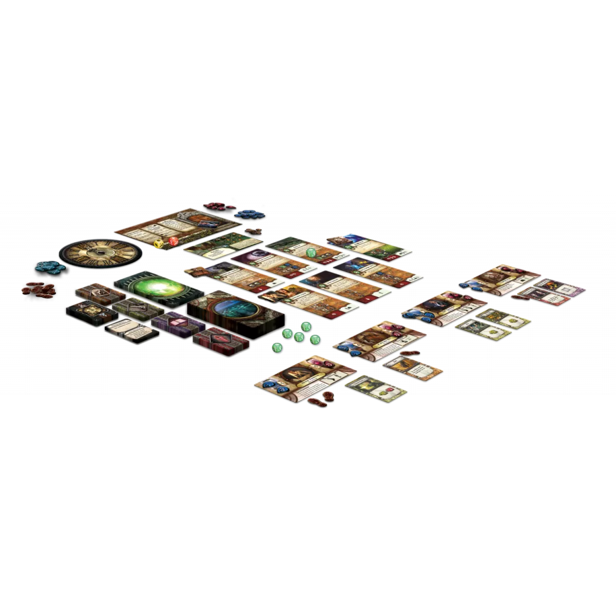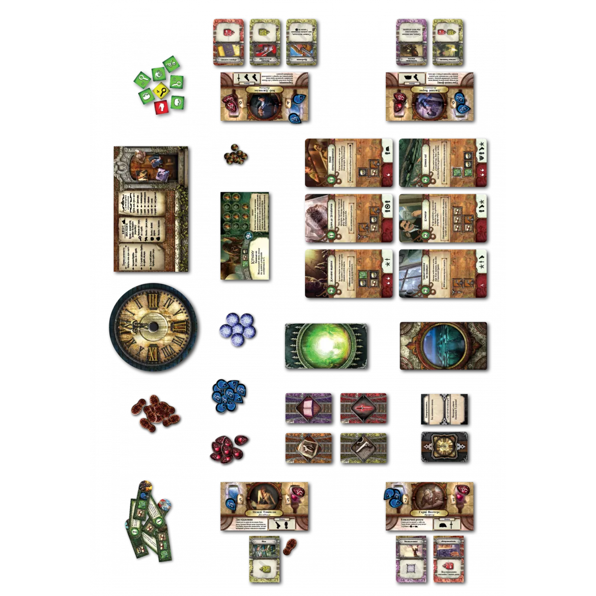 У коробці • правила, • 1 годинник, • 1 стрілка годинника, • 1 пластикова заклепка (для стрілки годинника), • 1 лист входу в музей, • 6 зелених кубиків, • 1 жовтий кубик, • 1 червоний кубик, • 80 карт (розміру «Таро») -, - 8 карт Стародавніх, - 16 карт дослідників, - 48 карт пригод, - 8 карт Інших світів, • 76 маленьких карт -, - 12 карт звичайних предметів, - 12 карт особливих предметів, - 12 карт заклинань, - 8 карт союзників, - 32 карти міту, • 144 картонні жетони -, - 16 жетонів дослідників, - 30 жетонів розуму, - 30 жетонів здоров’я, - 15 жетонів доказів, - 22 жетони монстрів, - 5 жетонів монстрів-масок, - 12 жетонів приреченості, - 17 жетонів знаків Старших богів