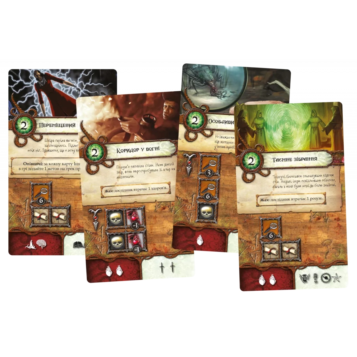 Карти пригод. На цих картах зображені різні кімнати та події в музеї, які гравці повинні дослідити, щоб знайти знаки Старших богів