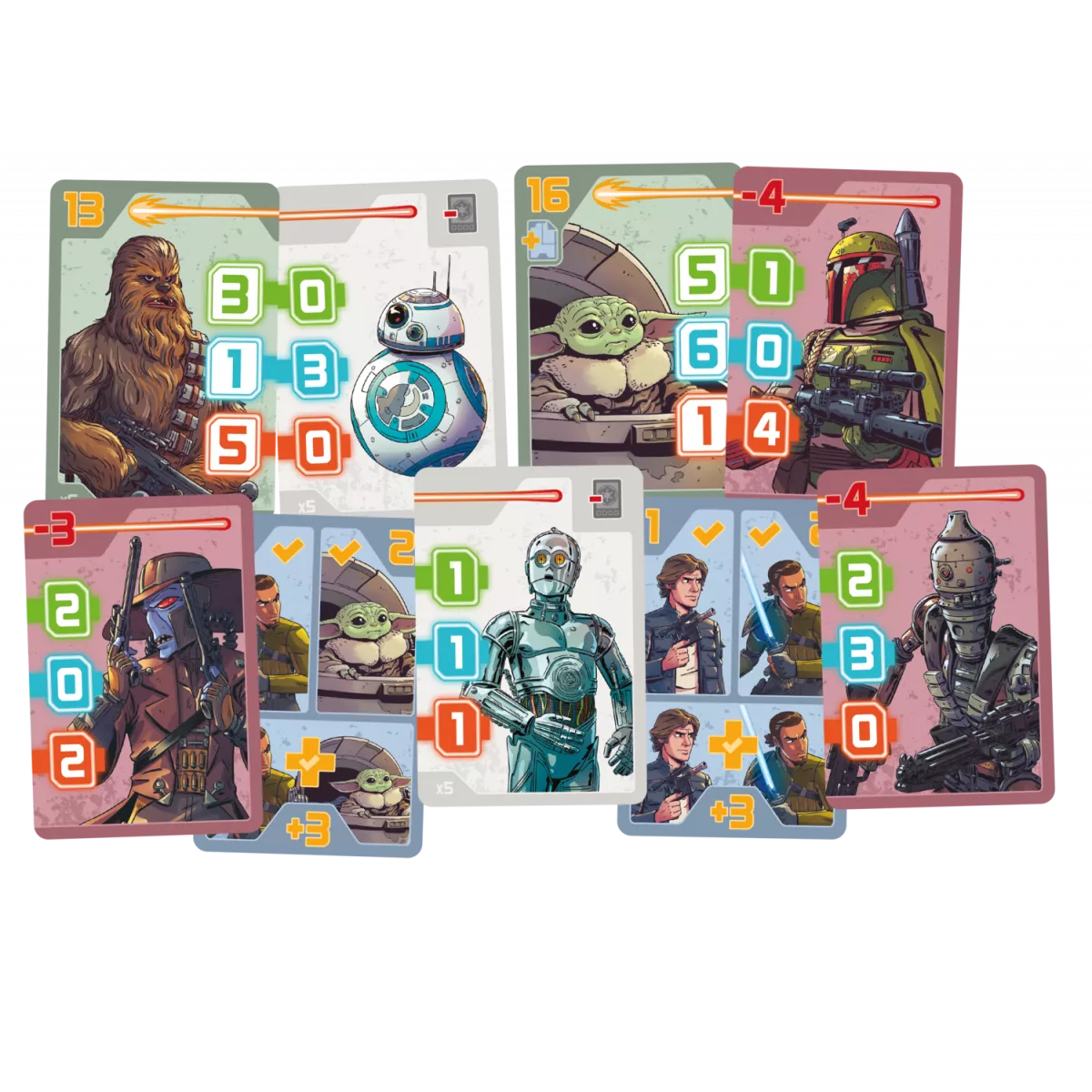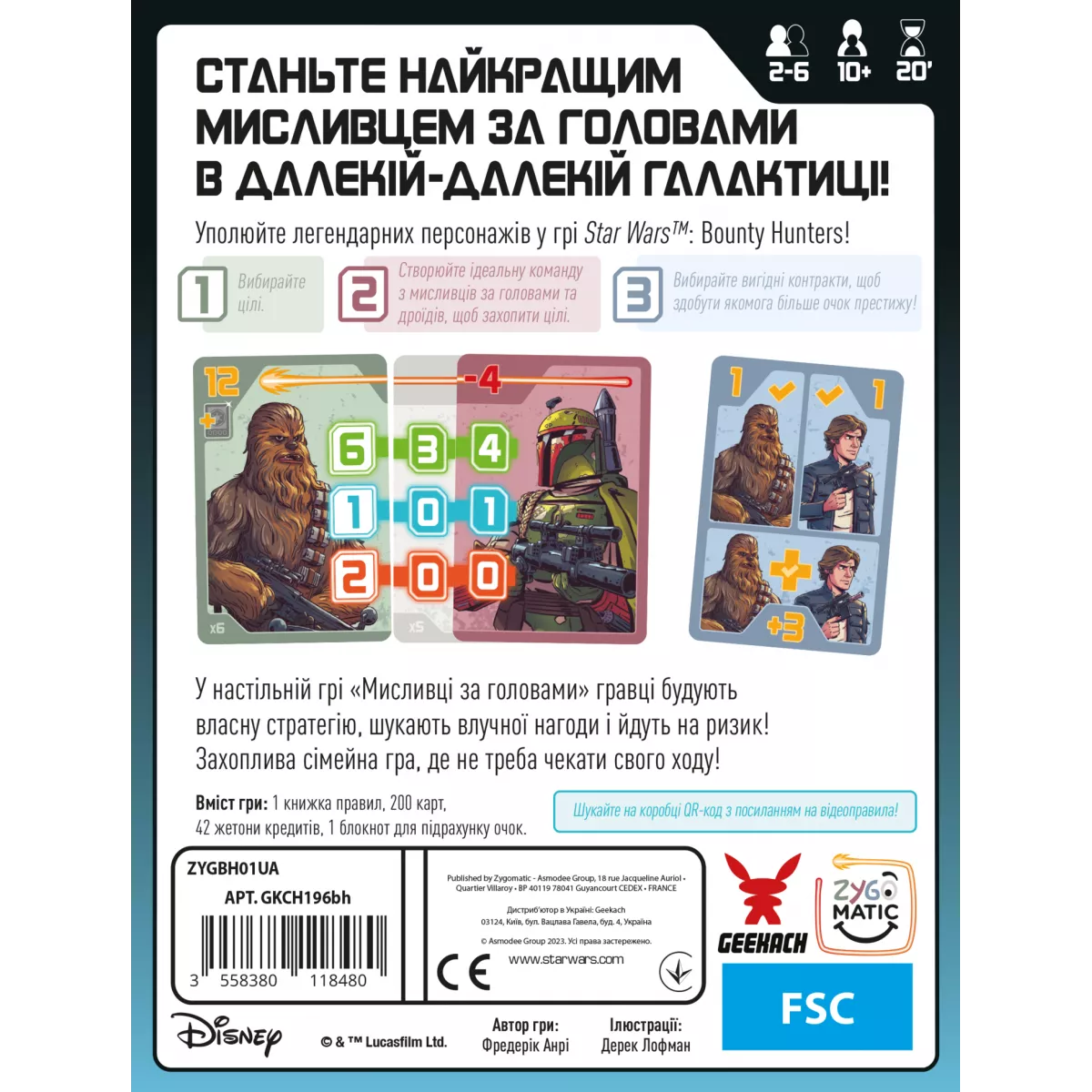 «Зоряні війни. Мисливці за головами» – це легка стратегічна карткова гра, у якій ви станете професійними мисливцями за головами, що розшукують цілі по всій неосяжній галактиці. Кого ви тільки не зустрінете в цій коробочці: Чубакку, Падме, Бобу Фетта, Гана Соло, Ґроґу,  IG-11… Знайдіть вірних союзників, озбройтеся дроїдами й захоплюйте цілі, щоб стати найвідомішим мисливцем за головами!