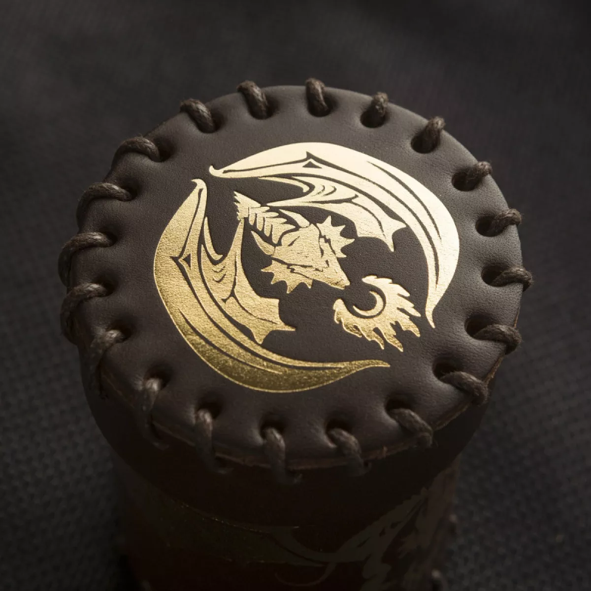Ласкаво просимо у світ, де кожна деталь має значення, а ігровий процес перетворюється на справжнє мистецтво! Представляємо вашій увазі унікальний аксесуар, який стане справжньою окрасою вашого ігрового столу та незамінним помічником у найзапекліших битвах настільних ігор – Стакан для кубиків Flying Dragon Brown & golden Leather Dice Cup. Це не просто предмет для кидання гральних кісток; це символ витонченого смаку, міцності та неперевершеної атмосфери фентезі, яка супроводжуватиме кожну вашу партію.