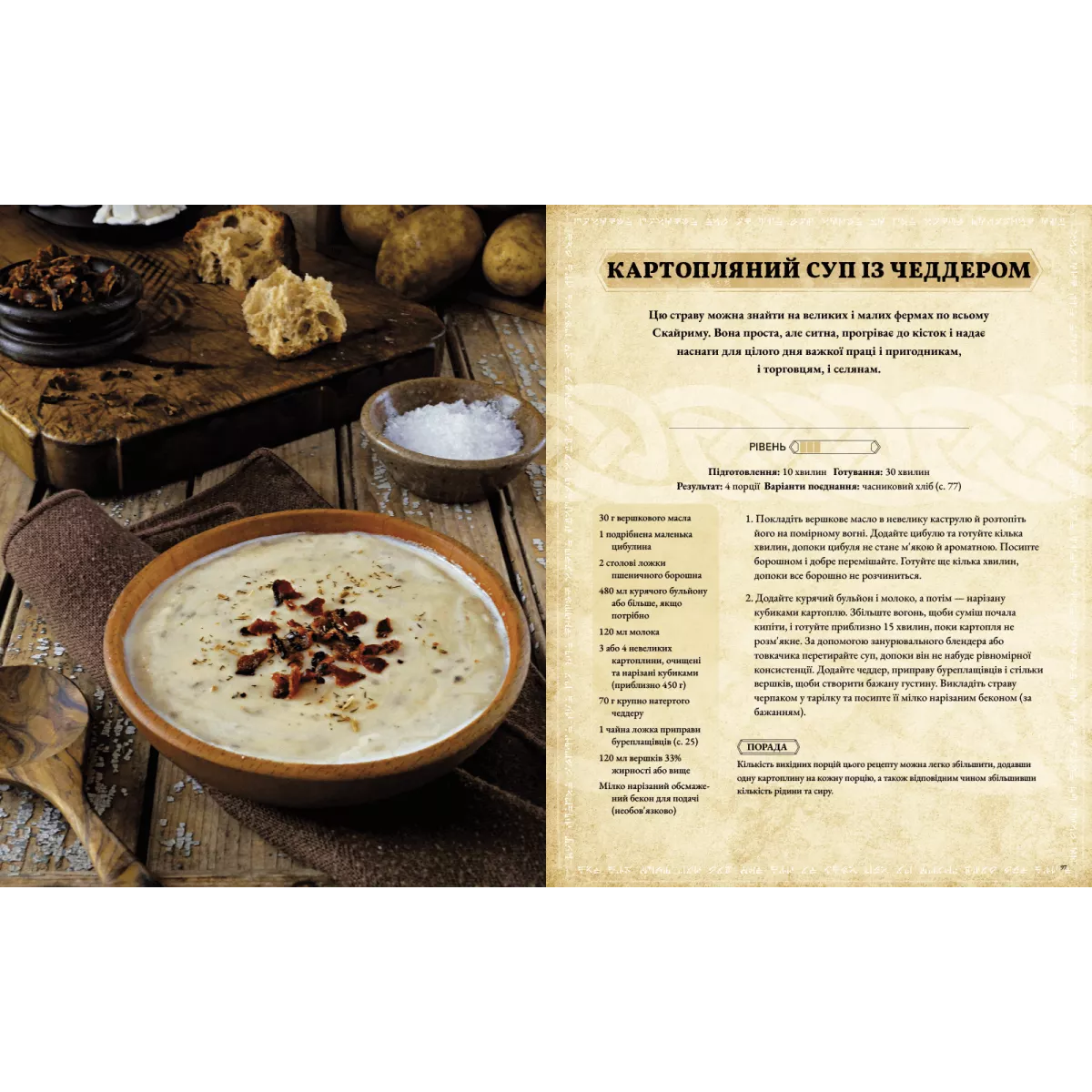 Смачні рецепти зі Скайриму, Морровінду та всього Тамрієлю. Книга присвячена серії легендарних відеоігор, та пропонує страви нордів, хаджитів та інших народів всесвіту Древніх сувоїв. Це доволі різноманітна їжа великих рас та регіонів, включаючи вегетаріанські, веганські та безглютенові варіації.